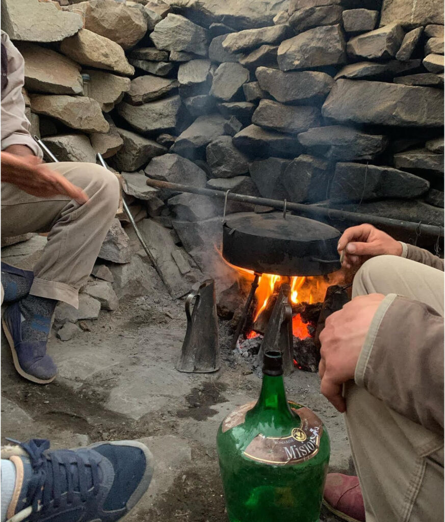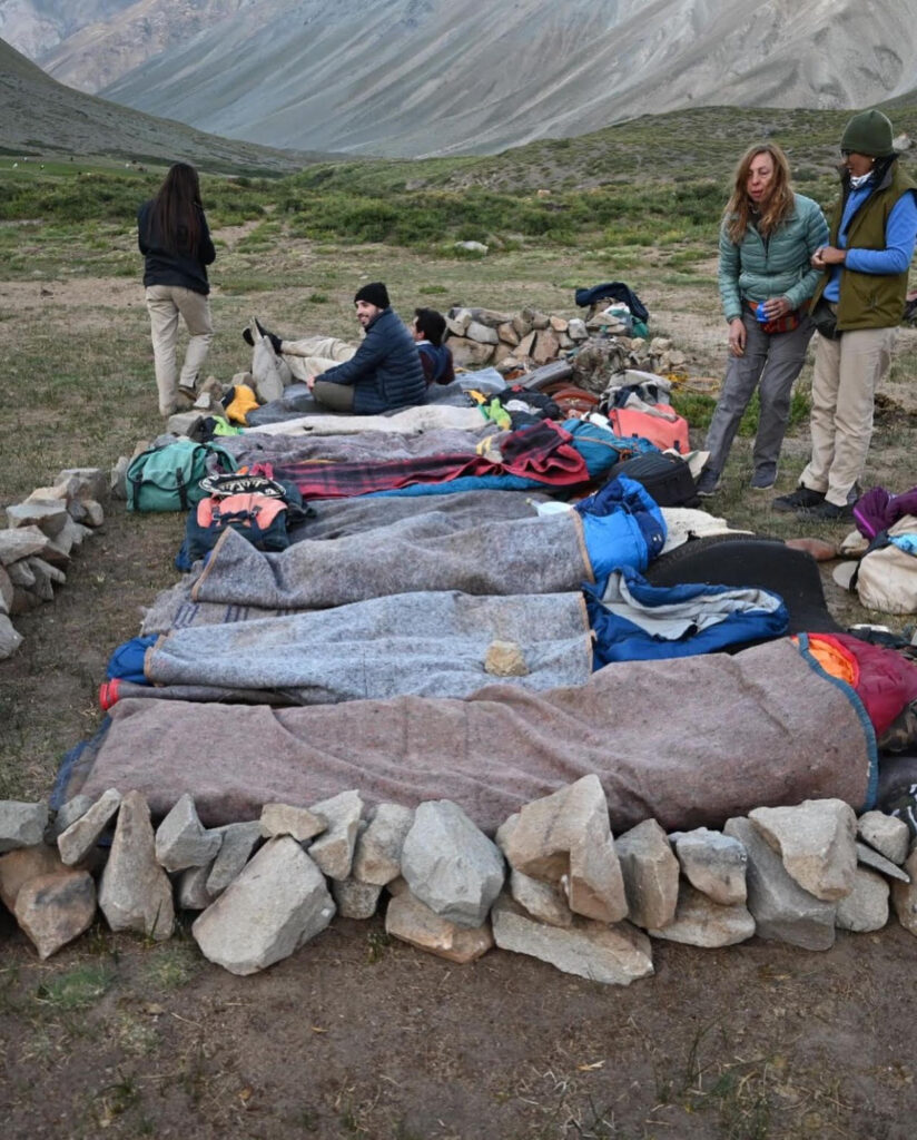 Nos esperan dos guías experimentados que además de enseñarnos donde nos ubicamos geográficamente, cuidan al grupo y los caballos con enorme responsabilidad. Un grupo de baqueanos, irá durante todo el trayecto a los costados del contingente, para asistirnos, guiar a la tropilla por las montañas y el cruce de los ríos. Las mulas cargarán lo más pesado, la mesa (que hará de camilla en caso de necesidad) los bártulos de cocina, alimentos y damajuanas.