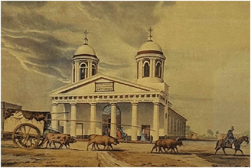 En la litografía podemos ver como gran protagonista al templo, con sus dos torres campanarios y su imponente fachada. Allí sobre el arquitrabe, es decir donde el peso de la cubierta se apoya en las columnas podemos ver una interesante inscripción: “Construido bajo los auspicios del Ex Restaurador Brig. Ge. D. Juan M. de Rosas” y por encima una cartela que pide protección al santo patrón San José. Frente a la arquitectura pasa una carreta junto a un hombre a caballo.