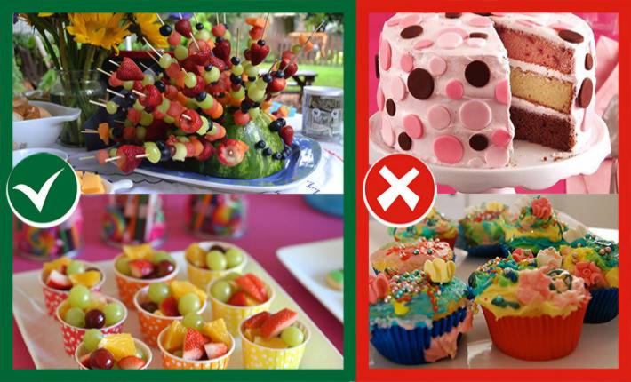 El menú de los cumpleaños tradicionales suele estar basado en alimentos ultra procesados, con un alto contenido de sodio, grasas y azúcares, como por ejemplo panchos, gaseosas, papas fritas y otros snacks, torta y bolsa de golosinas, entre otros. El menú que proponen los Cumpleaños Saludables contempla un 30% menos de calorías y grasas que el tradicional, 40% menos de azúcares y menos del 50% de sodio. El menú sugerido contiene algunas de las siguientes preparaciones: masa fina para pizza, patitas de pollo caseras al horno, muffins de choclo, agua saborizada de naranja sin azúcar (casera), panqueques de frutas, trufas y torta con frutas y dulce de leche, entre otros. En Cumpleaños Saludables no estará permitido el consumo de gaseosas, jugos azucarados y snacks comerciales.
