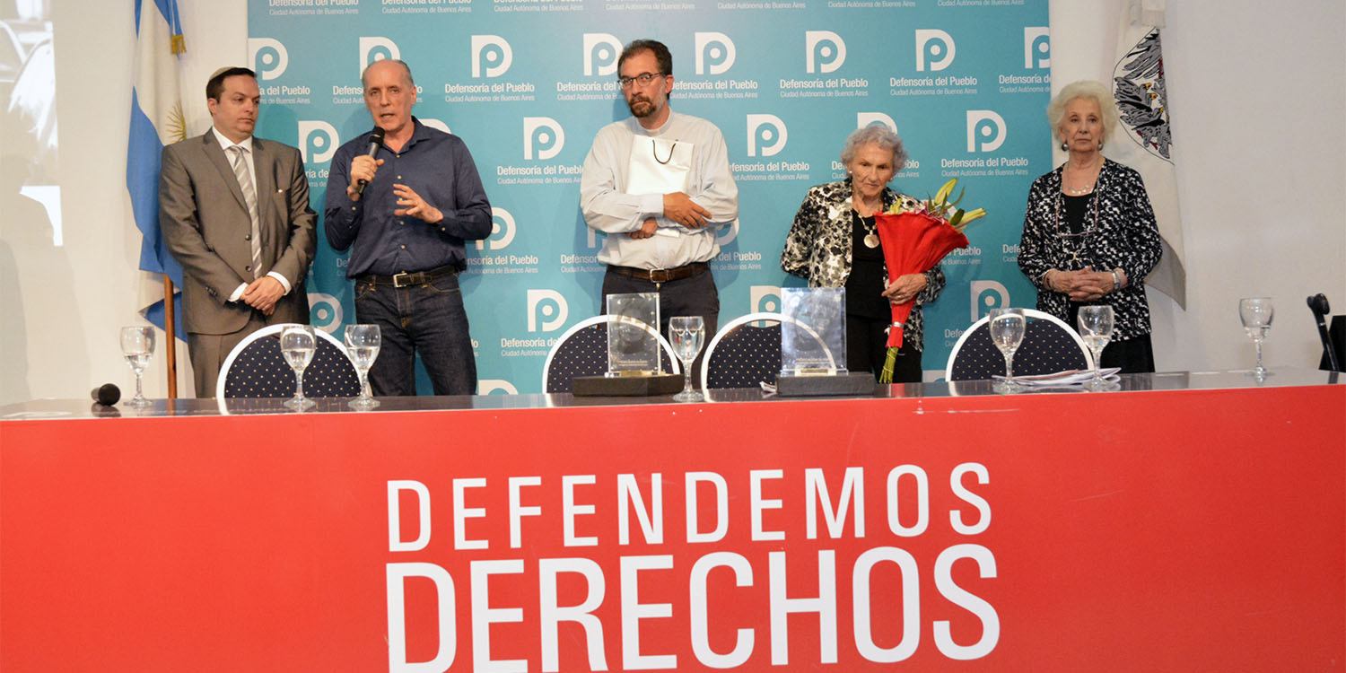 La presidenta de la organización Familiares de Desaparecidos y Detenidos por Razones Políticas y el flamante obispo auxiliar de la Ciudad de Buenos Aires recibieron la distinción de manos del Defensor del Pueblo Alejandro Amor y la presidenta de Abuelas de Plaza de Mayo, Estela de Carlotto.