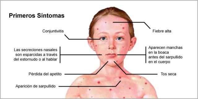 Los síntomas son un cuadro febril, que puede ser acompañado de conjuntivitis, secreción nasal, tos y aparición de manchas que empiezan a aparecer desde la cabeza y se extienden por cuello, tórax y pies.