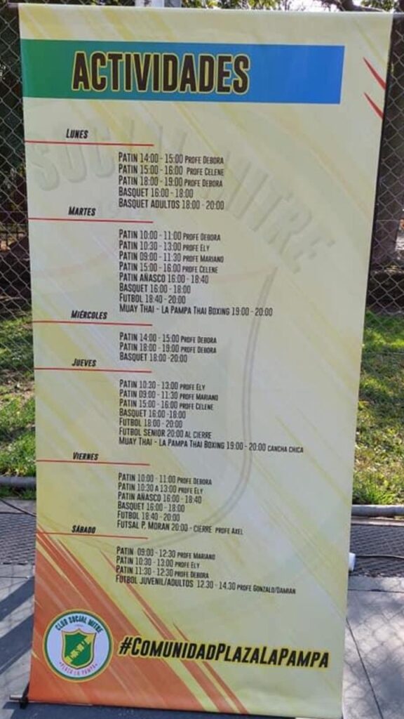 Martin nos cuenta que hay profesores de patín de distintos clubes, Paternal, Añasco, Villa Sahores, que dan sus clases en la plaza y que la cancha es de básquet y de futbol, y surgían peleas por su uso: “organizamos los horarios para que haya espacio para todos y baje el nivel de conflicto: patín está en los horarios que no hay gente, después de las 18 hs o antes del mediodía y determinamos que un día haya solo futbol, otro día solo básquet. Armamos un cartelera, “Comunidad Plaza La Pampa” donde figuran todos los horarios y actividades”…”cualquier vecino que tenga alguna inquietud o que quiera hacer alguna actividad puede venir, estamos todos los días…”.