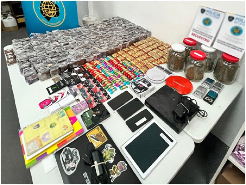 Como resultado fueron detenidos un hombre y una mujer y se secuestraron más de 500 productos comestibles con THC, más de 300 semillas de marihuana en troqueles y sueltas, más de 100 gomitas de THC en blísters y paquetes de armado casero, 7 kilos de marihuana, más de 400 plantas, 489 vapers y cartuchos, dinero en efectivo, 6 celulares, 2 discos rígidos, 1DVR, 1 Tablet, 1 notebook, 7 balanzas de precisión, 67 láminas troqueladas, 80 cajas de armado de vapers, 4 paquetes de bolsas transparentes de distintas medidas y 1 cuaderno con anotaciones de interés para la causa.