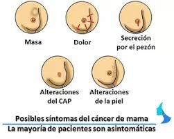 – Aparición de un nódulo palpable. – Dolor en la mama a la palpación. – Cambios de tamaño de alguna de las mamas. – Irregularidades en el contorno. – Menor movilidad de una de las mamas al levantar los brazos. – Alteración en la piel de la mama como úlceras, cambios de color y aparición de lo que se denomina piel de naranja (por su aspecto similar a la piel de dicha fruta). – Cambios en el pezón, como retracción del mismo (hundimiento). – Aparición de un nódulo en la axila.