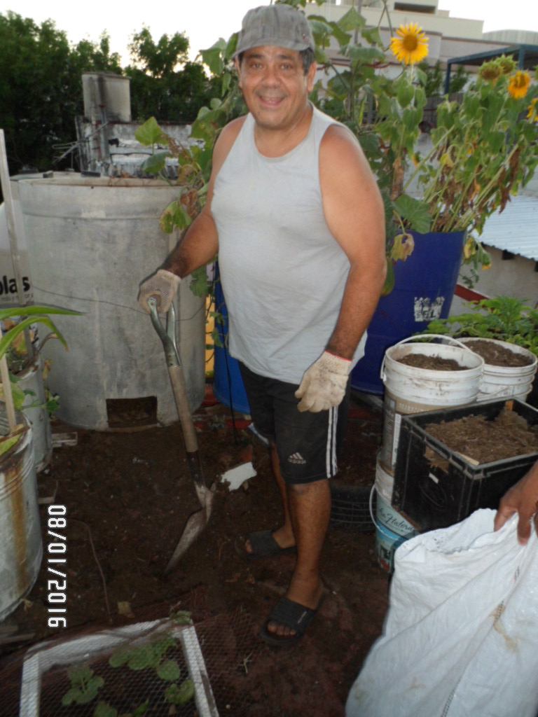 Lo llaman el Recilador y fue en el 2012 que comenzó a armar una huerta en los 60 mts cuadrados de su terraza. Sin un peso pudo ingeniárselas para conseguir tierra de la calle, contenedores tipo ruedas de auto, tachos de pintura de 20 lts. de helados de 10 lts. y todo lo que la gente consideraba basura, él lo reutilizó en su huerta.