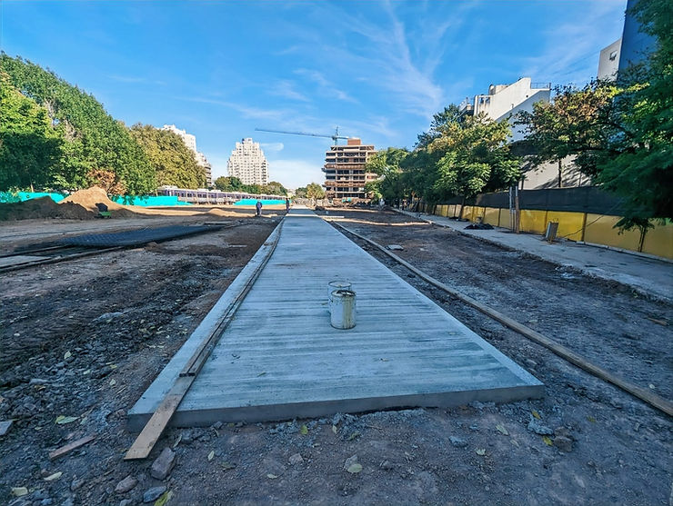 Camino recto de hormigón armado rodeado de tierra, en el Playón ferroviario de Colegiales. A fondo se ve un edificio en construcción dentro del mismo predio.