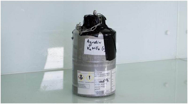 Además de adquirir conocimientos acerca de la química del flúor, su manipulación y el manejo de las líneas de vacío necesarias para su uso en laboratorios, Spaltro aprovechó la estadía en Alemania para preparar una sal, o hexafluoroniquelato de potasio, resultante de la síntesis bajo ciertas condiciones experimentales de otras dos sales –fluoruro de níquel y fluoruro de potasio– que es capaz, primero, de absorber el flúor en su estado gaseoso; luego, de contenerlo inactivo; y finalmente, de liberarlo por calentamiento, a temperaturas superiores a los 450 grados centígrados. La muestra que llegó al país es de casi dos kilos y medio, con lo que se estima se podrían producir cerca de 220 litros de flúor. “Una vez que se libera el flúor contenido, el subproducto resultante es capaz de ser fluorado nuevamente para que vuelva a absorber flúor. Si bien no de manera infinita, se lo puede reutilizar para seguir produciendo”, comenta el profesional.