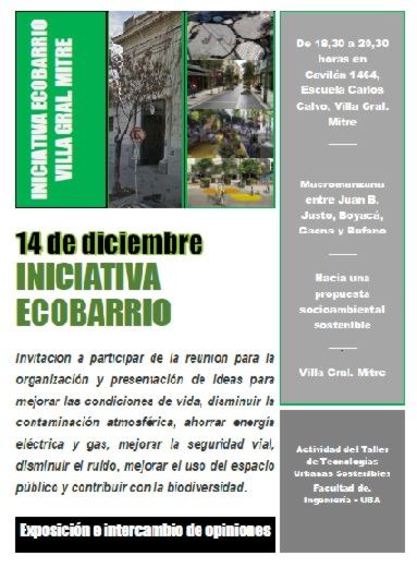 El viernes 14 de diciembre de 18,30 a 20,30 hs, se realizará la segunda reunión para desarrollar la “Iniciativa Ecobarrio” para Villa Gral. Mitre, en la Escuela de Recuperación Carlos Calvo, ubicada en Gavilán 1664.