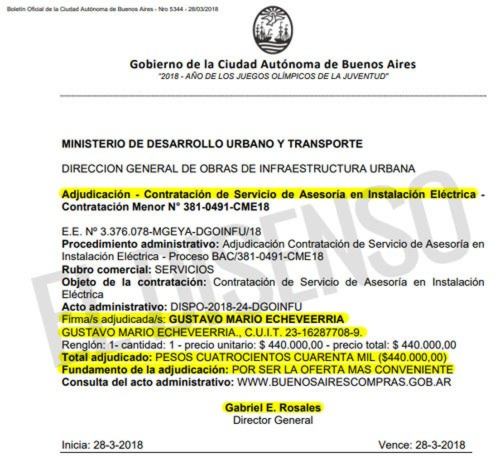 De acuerdo a la Orden de Compra 381-3643-OC18 autorizada el viernes 6 de abril, Gustavo Mario Echeverría resultó adjudicatario de la licitación EX-2018-06768450-MGEYA-DGTALMDUYT del Ministerio de Desarrollo Urbano y Transporte, y cobrará $440.000 por un asesoramiento en “Instalación eléctrica” que puede ampliarse en $88.000 y prorrogarse por otros $440.000.