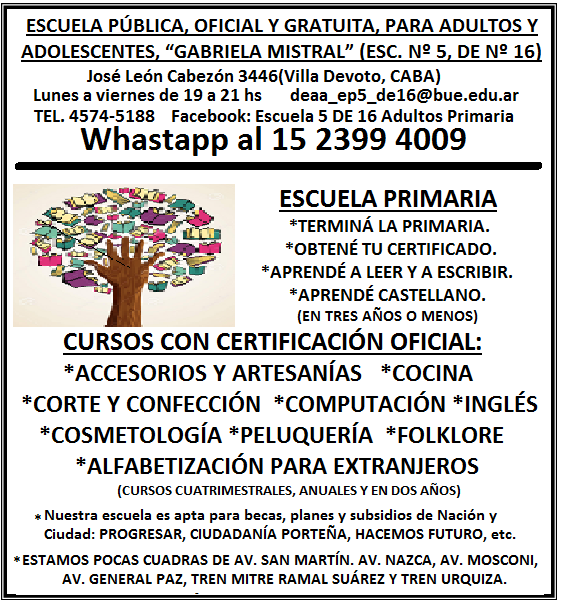 “Me comunico para remitirles una solicitud que me llega desde la dirección de la escuela número 5 del distrito 16 para adultos. Están con dificultades para hacer llegar la oferta de la escuela por lo cual están teniendo pocas inscripciones. Me solicitaron ayuda para difundir la oferta que brinda la institución, y quería saber si podrían darnos una mano publicándola en su medio barrial ya sea digitalmente o en papel”.