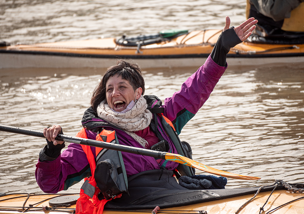 Amaneciendo al último día, nos quisimos besar con el tiempo y bailamos calentando el cuerpo, siguiendo los ejercicios que el médico guiaba. Fuimos a recorrer las aguas bajas del Bajo Delta, hasta el Dique Luján y más allá, en el último momento de encarar la llegada, salió con toda la potencia, que era lo único que teníamos a mano, la caravana activista de kayaks. Ya éramos muches, incontables, botes y lanchas y remos y canciones. Las amigas Brisa y Anita se arrimaron. Brisa dijo: “Nos enteramos que venían escoltados solo por Prefectura y dijimos: «Esto no puede ser»”. Le pedimos a las cantoras el aliento que ya escaseaba y sobre nuestros remos se oyó tan dulce la canción de Chacho Muller, luego otra y otra, hasta que “El jangadero” y “El cosechero” nos convirtieron en un coro de emociones cantoras, y allá el bote de Martín con su bandera, con su compañera flotando en el aire, y toda la inspiración que para nosotres es sentir la presencia de lxs ancestrxs que en su tiempo afloraron para sembrarnos en su ejemplo.