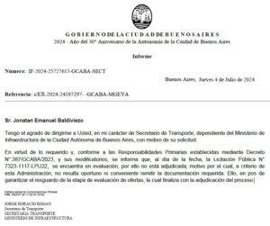 Solicitamos los datos actuales que derivan de las ofertas de las empresas, pero el secretario de Transporte, Jorge Horacio Kogan, el 5 de julio denegó la información pública sosteniendo que “la Licitación Pública N.º 7323-1117-LPU22 se encuentra en evaluación, por ello no está adjudicada; motivo por el cual, a criterio de esta Administración, no resulta oportuno ni conveniente remitir la documentación requerida. Ello, en pos de garantizar el resguardo de la etapa de evaluación de ofertas, la cual finaliza con la adjudicación del proceso”.