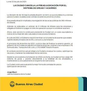 El día lunes 22 de julio, Jorge Macri denunció públicamente irregularidades en el proceso licitatorio del Servicio Público de Grúas para Acarreo de Autos y tomó la decisión de anular la licitación.